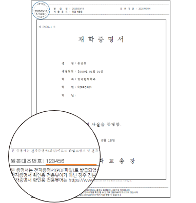 • 발급된 문서하단에 2차원 바코드가 출력된 증명서인 경우 바코드 검증 프로그램으로원본대조 할수 있습니다